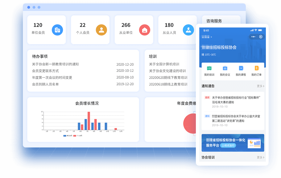 安訊協(xié)會一體化服務平臺,是按照“互聯(lián)網(wǎng)+社會組織”的理念,采用 “云計算、大數(shù)據(jù)”等先進信息技術(shù),立足協(xié)會服務會員、規(guī)范市場秩序、開展行業(yè)自律等需求,建立的一體化管理與服務平臺,集成會員、從業(yè)人員、從業(yè)單位管理,通知、培訓、會議、咨詢、資源、直播服務,以及門戶網(wǎng)站、移動應用,實現(xiàn)協(xié)會各業(yè)務數(shù)字化整合,全面提升各方獲得感,為協(xié)會服務國家、社會、行業(yè)提供全面的信息化支撐。